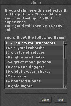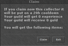 Those can be claimed each between 20h, sending all the loot to the inbox of the player who claimed it, the collected money is sent directly to the guild bank and the experience is added to your guild level.